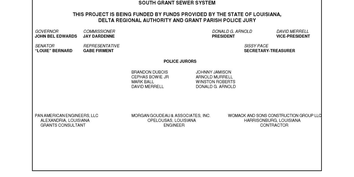 Grant Parish has been working since 2007 to develop a feasible plan for expanded wastewater treatment and collection service in southern Grant Parish near the Rapides Parish line. This particular area of Grant Parish is experiencing a higher growth rate than other areas due to its adjacency to north Rapides Parish, new localized commercial developments, the 4-laning of U.S. 165, and the enlargement of the federal prison complex in Pollock.